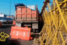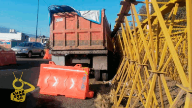 STAFF/@michangoonga/RED-113 Un camión tipo volteo, el cual transportaba varilla, se estrelló contra la inservible estructura de un puente peatonal ubicada…