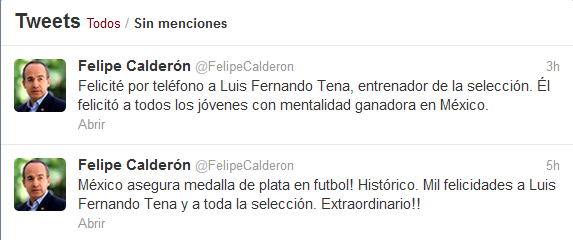 Esperemos que no los haya salado, pues el presidente Felipe Calderón Hinojosa felicitó a la Selección Olímpica Mexicana de Fútbol y a su entrenador Luis Fernando Tena, por el “extraordinario partido y la gran alegría que dieron a los mexicanos al asegurar una medalla”, luego de la victoria sobre Japón 3-1 este día en Londres 2012.