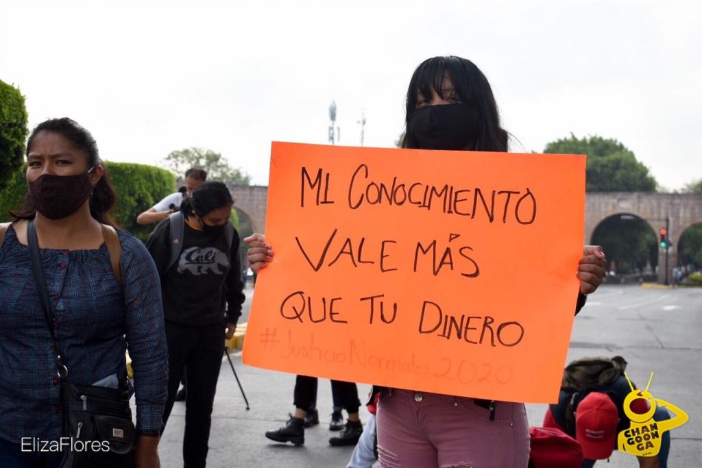 Muy pocos asistentes se encuentran en el lugar, aspirantes y padres de familia se manifiestan bloqueando la glorieta de las tarascas, con pancartas que aseveran la corrupción en el proceso de selección e ingreso a las normales.
