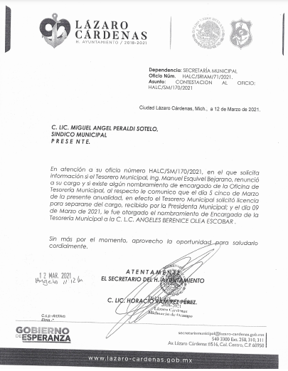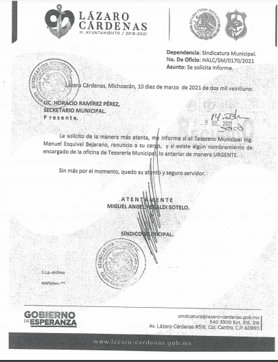 Trabajadores de la administración pública de Lázaro Cárdenas han señalado que la renuncia del tesorero municipal, Manuel Esquivel Bejarano se dio como una acción arbitraria y sin transparencia, la cual habría aceptado María Itze Camacho, alcalde del municipio portuario.