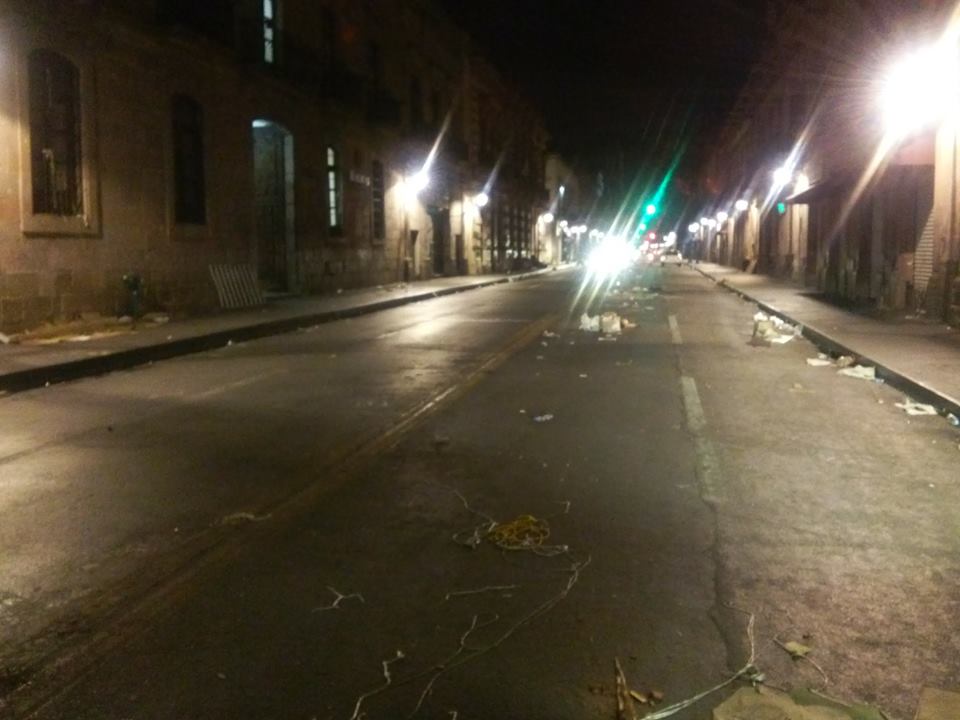 A las 2:30 am ya se encontraba libre el tránsito, solo había una patrulla en la esquina de Morelos con Madero, dejando cartones, basura orgánica y bolsas regados a lo largo y ancho de la Avenida.