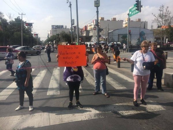 Una manifestación bloqueó la vialidad en la esquina de José Loreto Fabela y avenida 412 en San Juan de Aragón en la Ciudad de México por la presunta violación de 37 niños en un kinder.