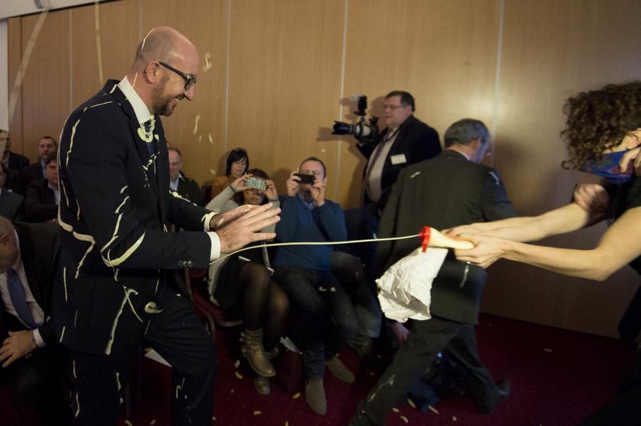 Así, el primer ministro belga y los invitados de primera fila fueron ensuciados con mayonesa y papas fritas, el plato nacional de Bélgica, arrojados por el colectivo, las cuales fueron retiradas inmediatamente por elementos de seguridad.