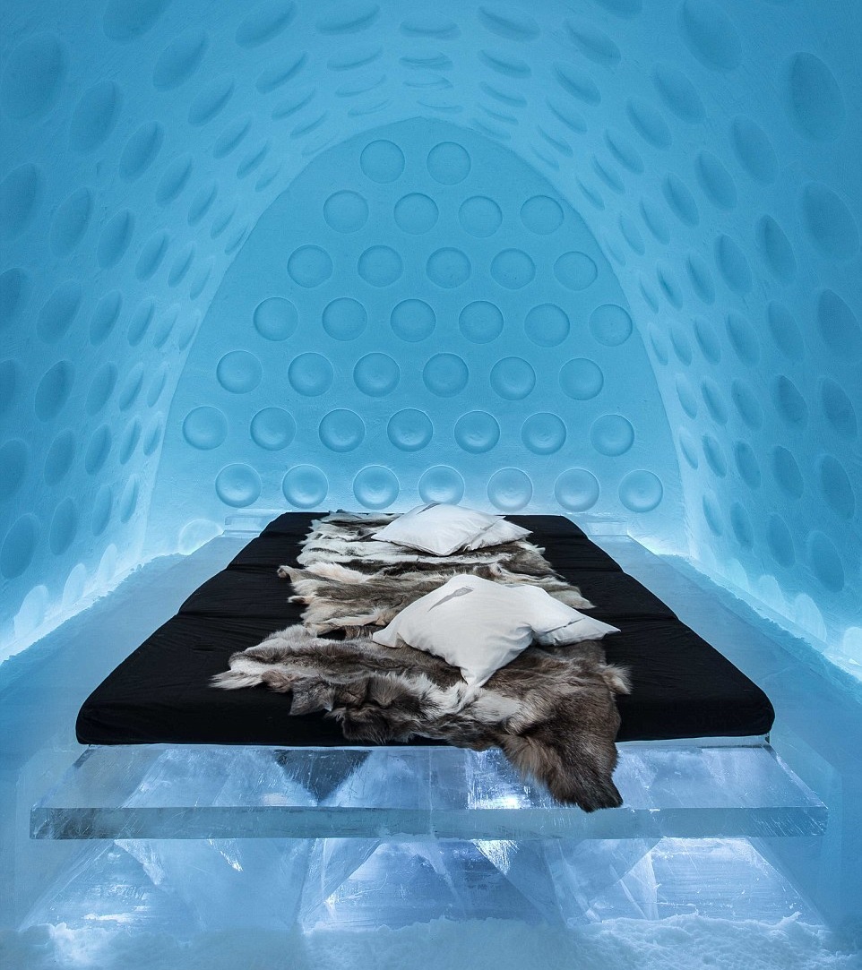 Como cada año el curioso y exclusivo Hotel de hielo está de vuelta. Para esta nueva edición se construyeron 19 suites temáticas elegidas de entre 130 propuestas, dos de las habitaciones cuentan con esculturas únicas hechas completamente de hielo: un elefante de más de tres metros de altura y un pavo real.