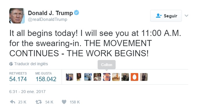 No hay fecha que no se llegue ni plazo que no se cumpla: Para empezar un día que sin duda será histórico para el mundo, el presidente electo de los Estados Unidos, Donald Trump, puso en marcha la jornada de su investidura con un tuit: «¡Todo empieza hoy!»