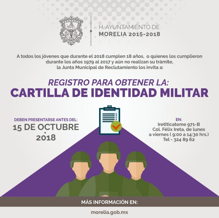 El Ayuntamiento de Morelia, a través de la Junta Municipal de Reclutamiento, invita a los ciudadanos que recientemente cumplieron la mayoría de edad, así como a quienes tienen pendiente de realizar este trámite, a llevar a cabo el registro para obtener la Cartilla de Identidad Militar.