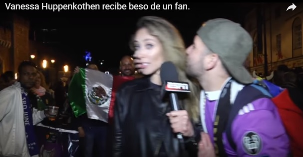 Ello por un beso que le plantó en pleno cachete izquierdo un fanático del Real Madrid mientras la conductora daba su reporte en vivo. Claro que Vanessa trató de evitar el beso sin conseguirlo, pero no dejó que esto influyera en su reporte y continuó con el.