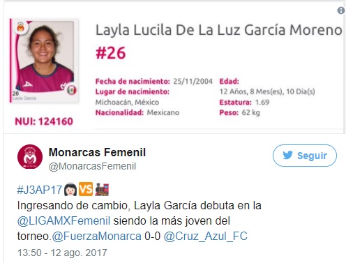 Con tan solo 12 años y 8 meses de edad, Layla García hizo historia al debutar ayer sábado en la Liga Femenil MX con las Canarias de Monarcas Morelia en la tercera jornada del torneo.