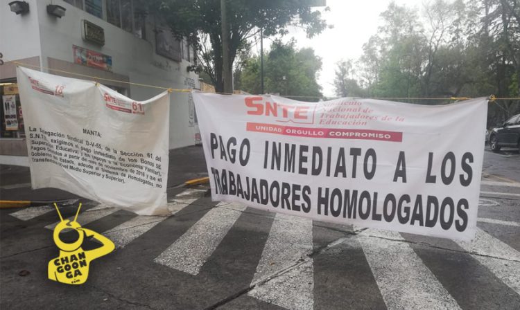 Integrantes del Sindicato Nacional de Trabajadores de la Educación (SNTE) realizan una manifestación en frente de la Secretaría de Finanzas y Administración de Michoacán (SFA) para exigir los pagos adeudados a los trabajadores homologados.