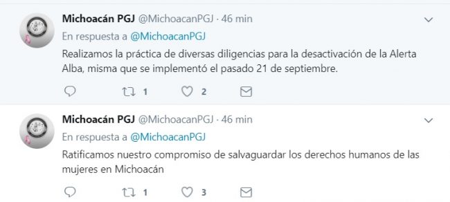 “Realizamos la práctica de diversas diligencias para la desactivación de la Alerta Alba, misma que se implementó el pasado 21 de septiembre”, refirió la Procuraduría mediante su cuenta de Twitter sin agregar más detalles de su localización.