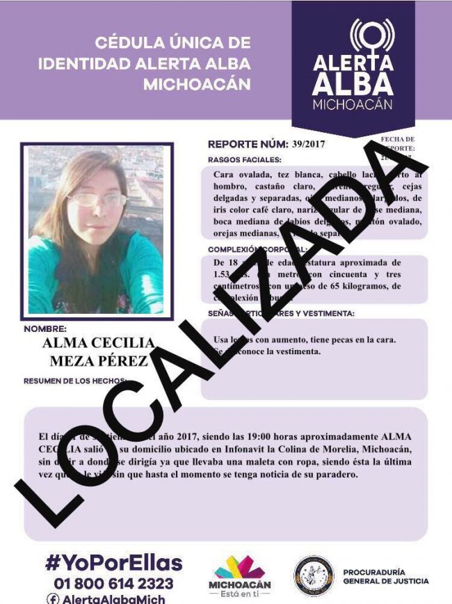 Luego de haber sido reportada desaparecida por su familia desde hace 26 días, la tarde de este viernes mediante redes sociales la Procuraduría de Justicia de Michoacán Informó que ha sido localizada la estudiante nicolaíta  Alma Cecilia M.  quien “ha arribado a Morelia para reencontrarse con su familia”, manifestó la dependencia.
