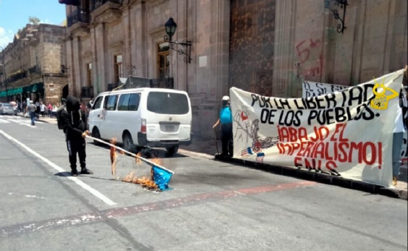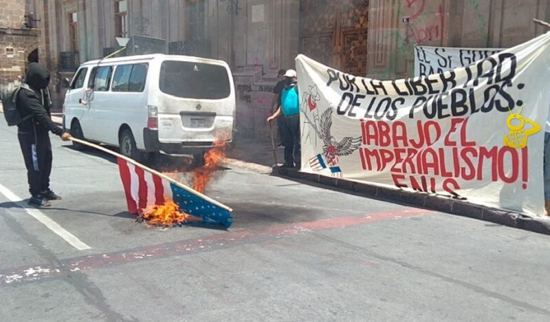 En repudio a la intromisión del vecino país del Norte en las políticas públicas y decisiones de México, el Frente Nacional de Lucha por el Socialismo (FNLS) realizó una manifestación frente al Palacio de Gobierno, como acto simbólico de protesta, los manifestantes quemaron una bandera de Estados Unidos.