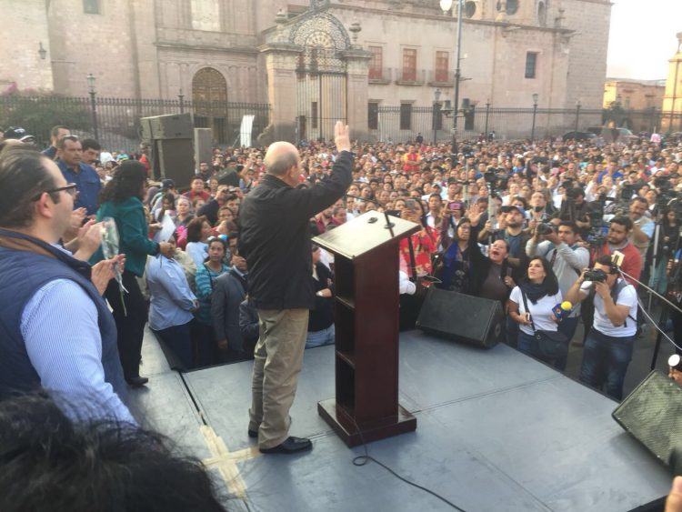 Entre la multitud que se dio cita esta tarde para acompañar a Fausto Vallejo en su mitin en la plaza Ocampo que convocó a más de mil personas, destacaba la figura de su vástago Rodrigo Vallejo ‘El Gerber’, el mismo que en 2014 fue acusado, encarcelado y posteriormente exonerado de presuntos vínculos con el crimen organizado, al ser revelados videos de presuntas reuniones suyas con el líder templario, Servando Gómez «La Tuta».
