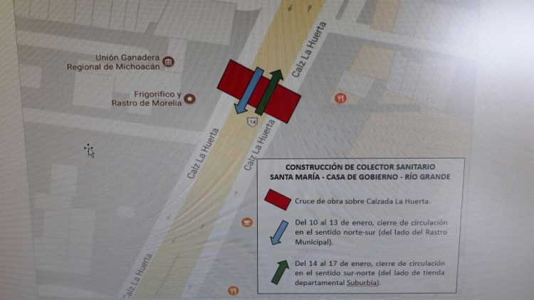 En aras de dotar a la ciudadanía de Morelia de una mejor calidad de vida con obras públicas que la beneficien, se avanza con la construcción del «Colector Sanitario Santa María-Casa de Gobierno-Río grande”, motivo por el cual se cerrarán los 4 carriles centrales de la Calzada la Huerta, hasta el jueves 17 de enero. El paso de la obra es justo a la altura del Rastro Municipal (cerca de conocido centro comercial).