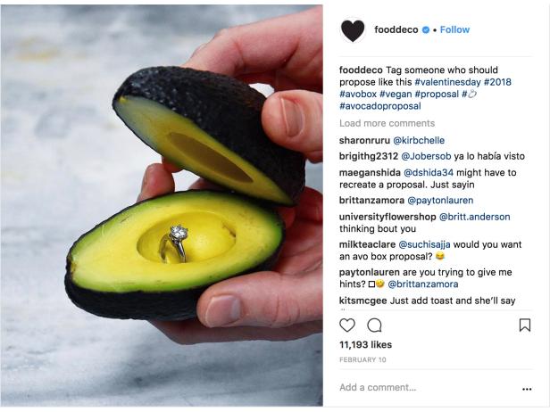 Y los millennials son quienes han socorrido a los aguacates creando ya una tendencia en Instagram para presumir lo valiente que son para pedirle bodorrio a su pareja para que pasen el resto de sus vidas juntos.