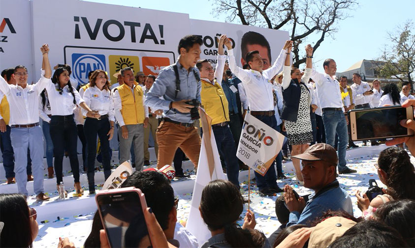 Pocas figuras nacionales arroparon a la fórmula perredista-panista que representan García Conejo y la albiazul Alma Mireya González, y el templete se terminó llenando con candidatos locales a diversos cargos por parte del Frente. Manuel Granados, dirigente nacional del PRD, y el diputado panista con licencia, Marko Cortés, fueron las únicas ‘figuras’ nacionales que se hicieron presentes.