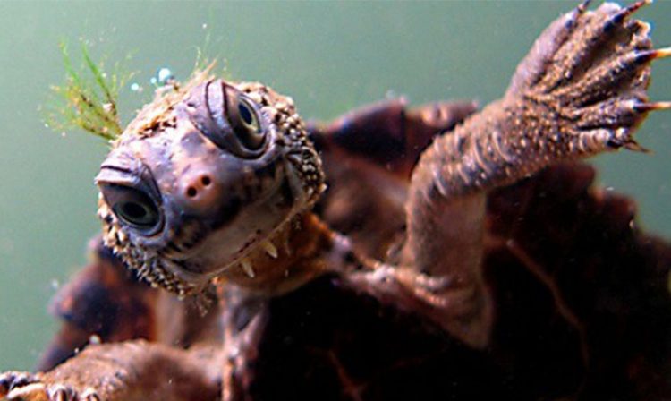 El pelo con tono verdoso es lo que más llama la atención, aunque solo se trata de algas que sirven como camuflaje. Mide 40 centímetros y tiene cola que puede crecer hasta un 70 % más que su caparazón, lo que es poco usual en las tortugas. Otra característica única es que, acuerdo con los especialistas, respira por el ano y la nariz.