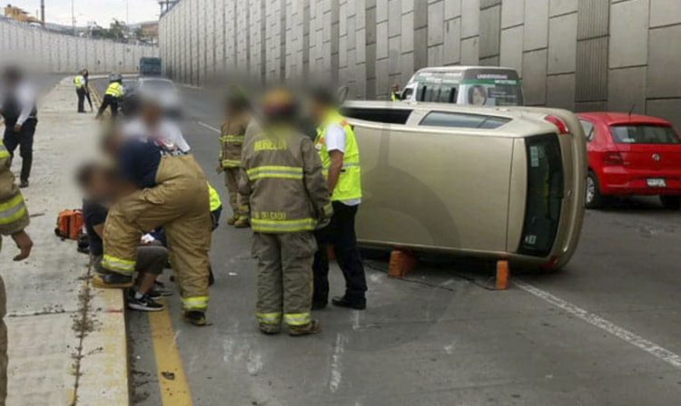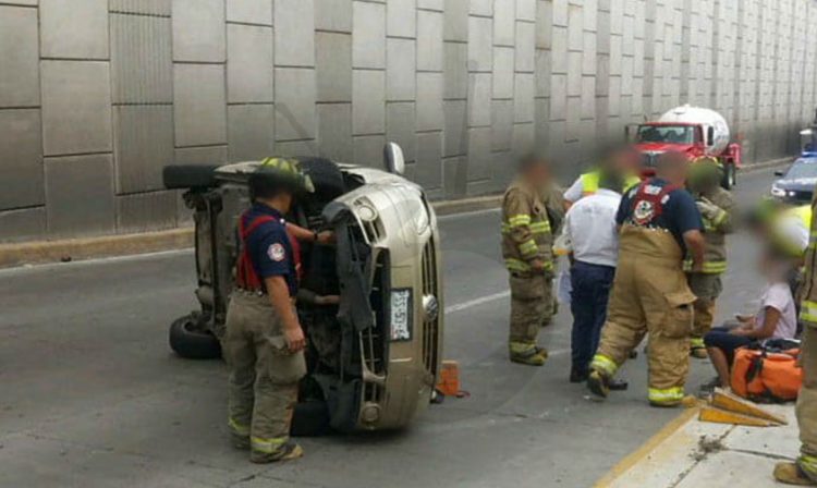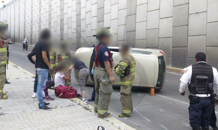 Leves contusiones sufrió una mujer y su adolescente hija cuando su vehículo volcó tras ser impactado por otro automóvil sobre los carriles del Periférico Paseo de la República, a pocos metros de los túneles del distribuidor vial salida a Quiroga, en las inmediaciones de la colonia La Quemada, revelaron fuentes policiales y de rescate.