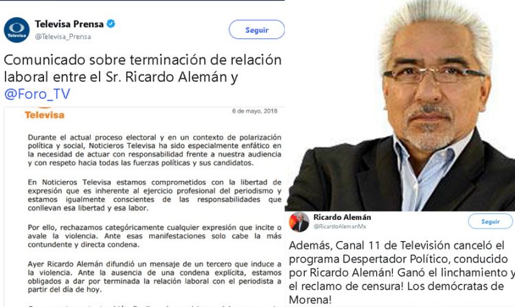 Además, Canal 11 de Televisión canceló el programa Despertador Político, conducido por Ricardo Alemán! Ganó el linchamiento y el reclamo de censura! Los demócratas de Morena!