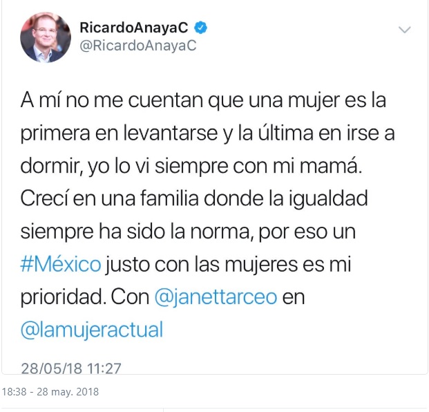 Por la mañana, Anaya Cortés escribió un mensaje en el que señaló que creció con la igualdad como norma en su casa, y que prueba de ello era que su madre era la primera en levantarse y la última en irse a dormir. El confuso concepto del panista sobre «igualdad» generó críticas de comunicadores, periodistas y activistas, como Estefanía Vela, responsable del área de Derechos Sexuales y Reproductivos del Programa de Derecho a la Salud del Centro de Investigación y Docencia Económicas (CIDE).