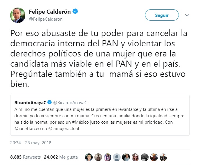 En su reacción, Calderón cuestionó el supuesto compromiso de Anaya con las mujeres con su supuesta intervención en el proceso de designación de la candidatura presidencial del PAN, que provocó la renuncia de Margarita Zavala a ese partido para competir por la vía independiente. Calderón Hinojosa pidió al candidato preguntar a su mamá si ese tipo de acción estuvo bien.