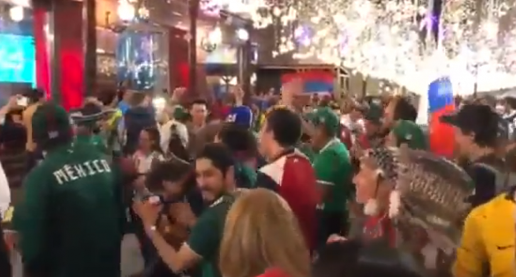 En un vídeo que circula en redes se nota como en las calles de Moscú, Rusia, los aficionados mexicanos le ponen su distintivo color, no sólo por las máscaras, vestiduras que llevan, las banderas, los trajes, los bigotes, los sombreros, las trompetas, sino también por la música.