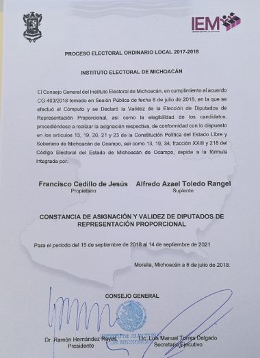 Esta mañana de lunes el Instituto Electoral de Michoacán (IEM) entregó la constancia que permitirá al Cedillo de Jesús llegar al Congreso local junto con su suplente Alfredo Azael Toledo Rangel.