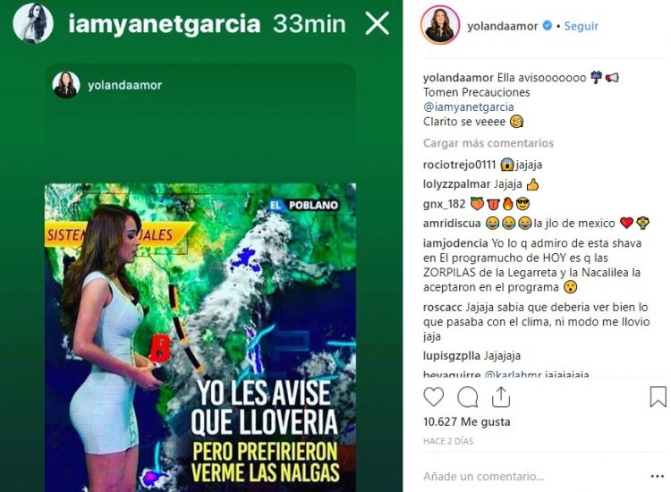 «Ella avisó, clarito se ve», fue lo que puso Yolanda junto a la imagen donde aparece Yanet de perfil, mientras informa sobre el clima «yo les avisé que lloviera, pero prefirieron verme las nalgas», dice el meme.
