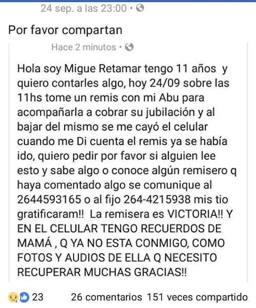 El caso ocurrió en Argentina y de acuerdo con medios locales, el mensaje de ayuda de Migue se ha viralizado en redes sociales luego de que el smartphone se le cayó en un transporte privado, cuando acompañaba a su abuela a cobrar su jubilación: