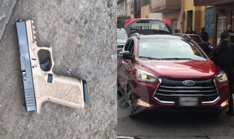 Posteriormente en el cruce de las calles de Lerdo de Tejada y Pino Suarez, los presuntos delincuentes detienen su unidad un Jac de color guinda con placas sobre puestas y disparan contra los guardianes del orden, mismos que repelen la agresión.