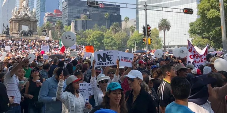Con pancartas y gritos, los asistentes al evento también llamado “Marcha Fifi”, protestaron en contra de la cancelación del Nuevo Aeropuerto de la Ciudad de México en Texcoco (NAIC), además de denunciar consultas “simuladas y fraudulentas”, haciendo referencia a la pasada consulta nacional sobre el NAIC.