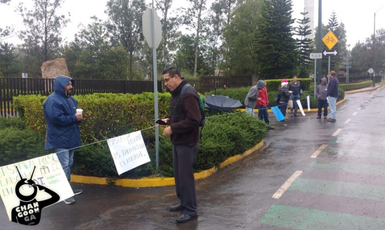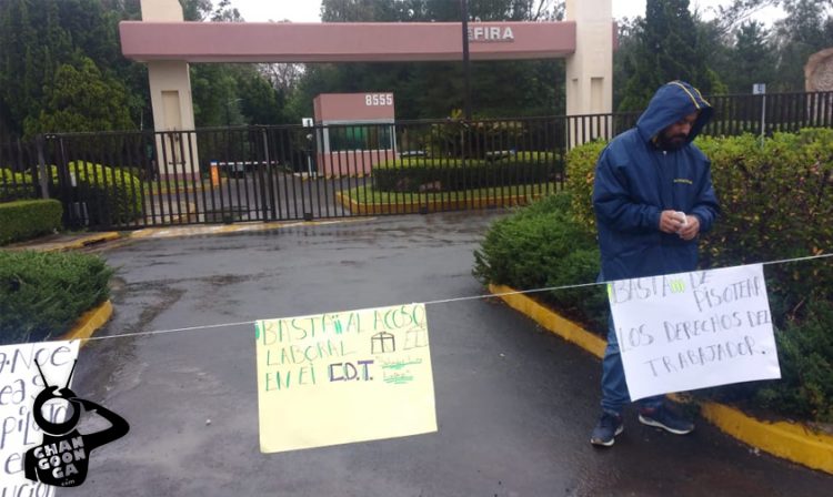 Portando pancartas denunciando acoso laboral y violaciones a sus derechos laborales, una decena de trabajadores del Fideicomiso Instituido en Relación a Agricultura (FIRA) se encuentran bloqueando la sede de dicha institución federal ubicada al sur de Morelia.