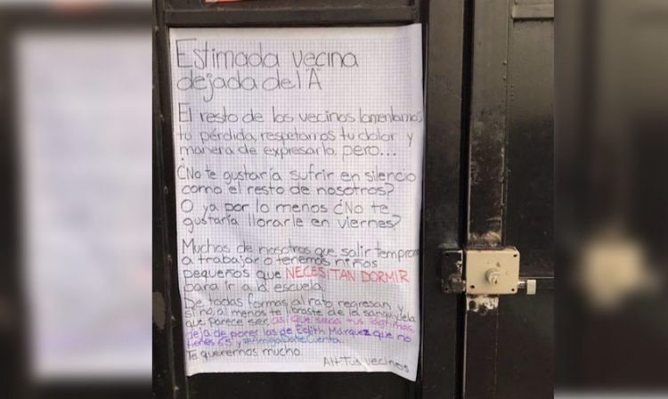 En dicha carta la cual fue expuesta ante todo el edificio decía: Respetamos tu pérdida, tu dolor, y manera de expresarlo, pero… ¿No te gustaría sufrir en silencio? O ya por lo menos ¿No te gustaría llorarle en viernes?”