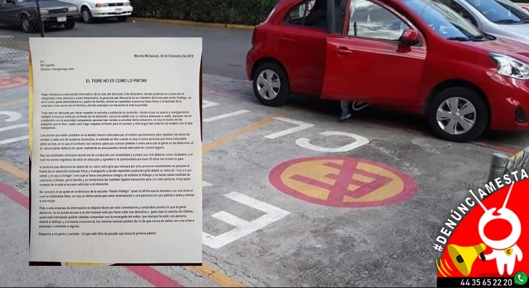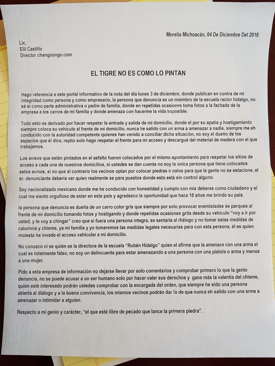 Hago referencia a este portal informativo de la nota del día lunes 3 de diciembre, donde publican en contra de mi integridad como persona y como empresario, la persona que denuncia es un miembro de la escuela Rector Hidalgo, no sé si como parte administrativa o padre de familia, donde en repetidas ocasiones toma fotos a la fachada de la empresa a los carros de mi familia y donde amenaza con hacerme la vida imposible.