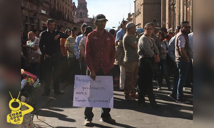 Michoacanos se manifestaron para exigir al mandatario federal, Andrés Manuel López Obrador, “Abrazos No Gasolinazo, AMLO Cumple tu promesa”, “Baja la gasolina”, en su visita por primera vez a la capital del estado.