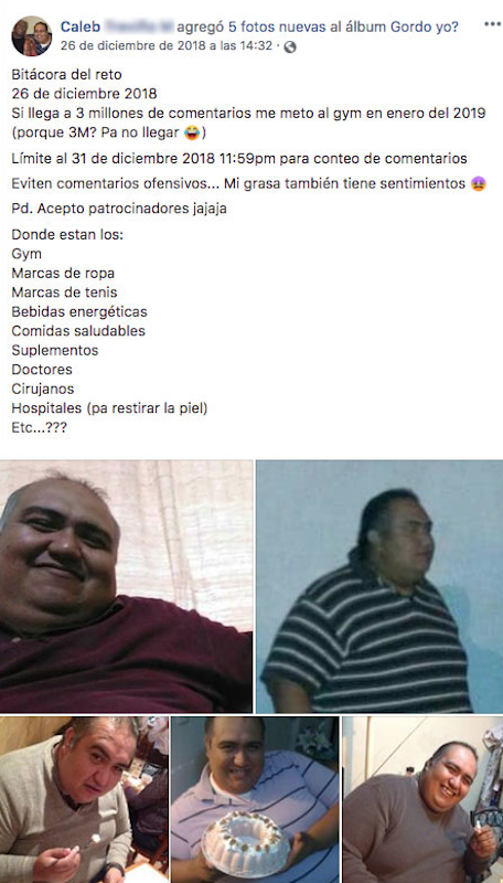 «Lo que empezó como un juego entre mi esposa y yo, ya rebasó lo impensable para nosotros. Estaré compartiendo todo el proceso de esta locura», escribió Caleb en una nueva cuenta de Facebook donde dará seguimiento de su pérdida de peso.