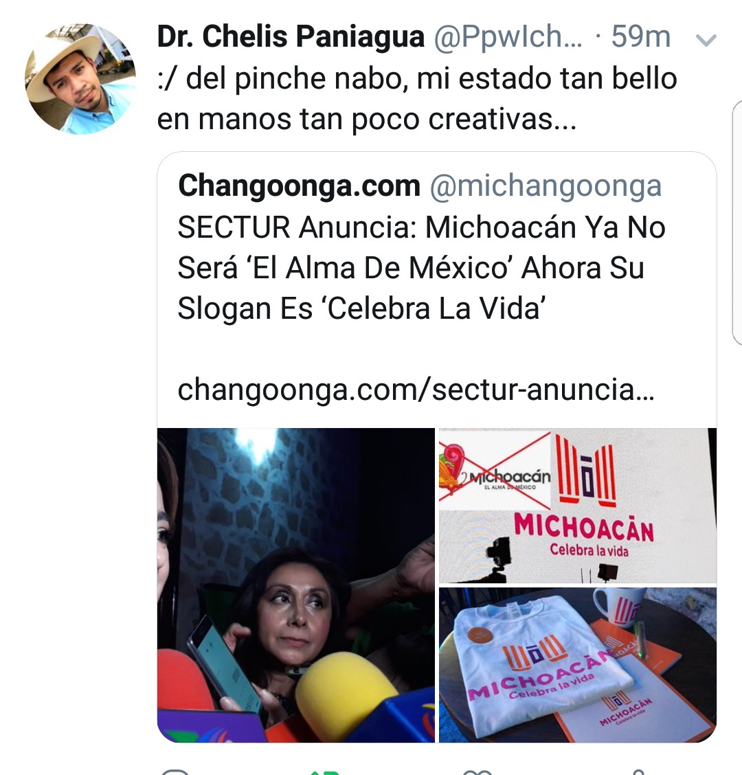 ¿Dos tarros de cerveza, una copia del logo de Liverpool, o inspirado en el del Metro de la CDMX? El caso es que el nuevo logo de identidad turística de Michoacán fue presentado la tarde de este jueves, y las críticas no se han hecho esperar, tras desplazar la antigua imagen y slogan de una mariposa en glifo de la cultura purépecha (en representación de las Monarcas) acompañada de “Michoacán, el Alma de México”. que duró 17 años, para dar paso a “Michoacán Celebra la vida” con un logo minimalista, estilizado, y que a ciencia cierta, de primera impresión, no se sabe qué carajos es?