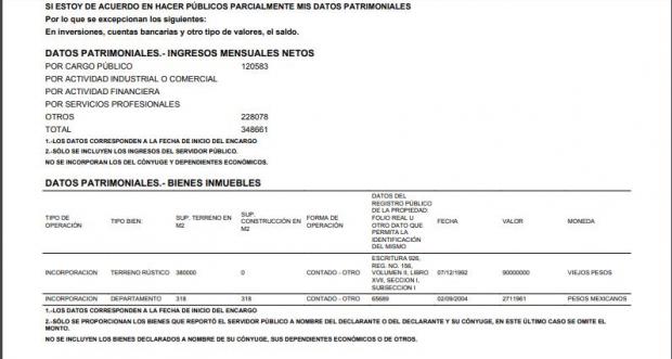 Además, Sánchez Cordero declaró poseer un terreno de 380 mil metros cuadrados, adquirido en 1992 con un costo de 90 millones de pesos de esa época.