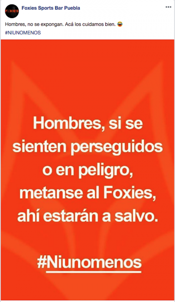 El post publicado en su cuenta oficial de Facebook, señala: “Hombres, si se sienten perseguidos o en peligro, métanse al Foxies, ahí estarán a salvo #NiUnoMenos”.