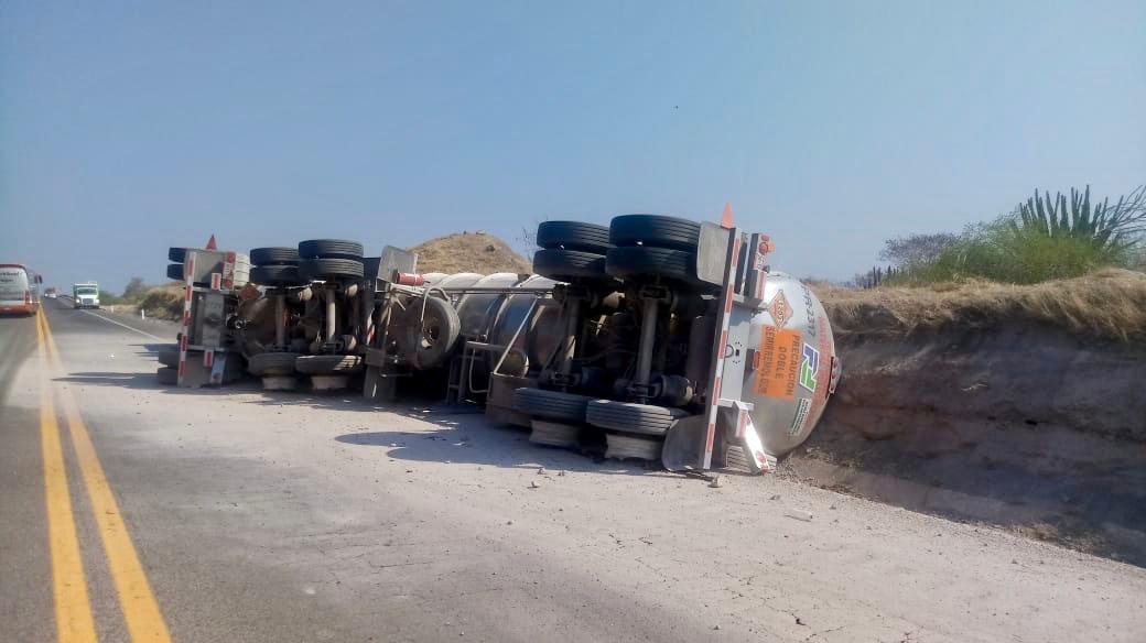 Una pipa de doble remolque cargada con cientos de litros de gasolina volcó en la autopista “Siglo XXI” y tuvo un derrame, a consecuencia del percance hubo un lesionado, confirmaron las autoridades de Protección Civil.