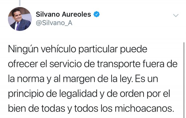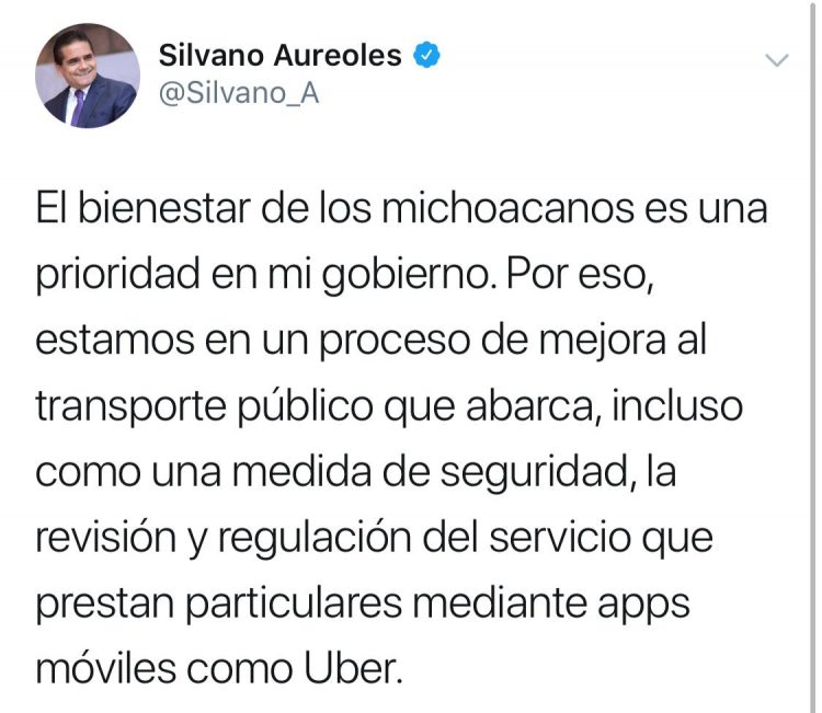 “El bienestar de los michoacanos es una prioridad en mi gobierno. Por eso, estamos en un proceso de mejora al transporte público que abarca, incluso como una medida de seguridad, la revisión y regulación del servicio que prestan particulares mediante apps móviles como Uber”, se lee en el post del mandatario.