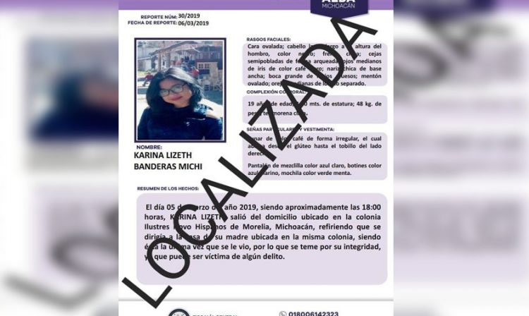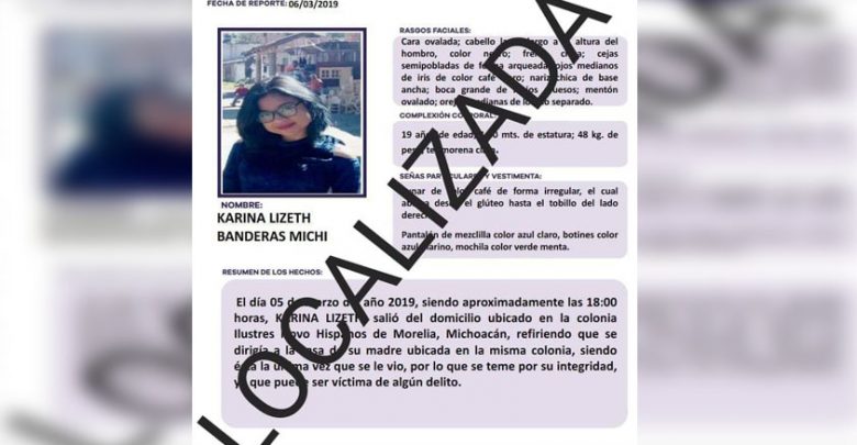 Personal de la Fiscalía General del Estado de Michoacán (FGE), localizó a una joven de 19 años de edad que el pasado martes fue reportada desaparecida en esta capital.