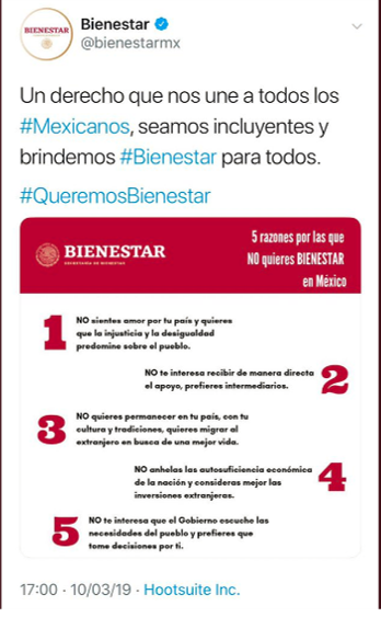 El pasado domingo causó polémica en redes sociales una imagen publicada por la Secretaría de Bienestar del Gobierno de México, en la que se leía: “5 razones por las que NO quieres BIENESTAR en México”, por lo que minutos más tarde fue eliminada.