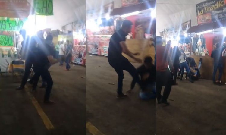 En el material se observa que se encuentra en la zona gastronómica cuando empieza el pleito entre varios hombres quienes se dejan ir a golpe limpio.