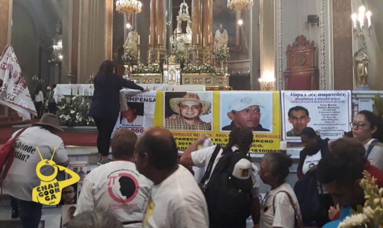 Con fotografías de las personas desaparecidas puestas sobre el altar, familiares de la Quinta Caravana Internacional de Personas Desaparecidas, presencian misa en la Catedral de Morelia, que fue oficiada por el Obispo Auxiliar, Herculano Medina.