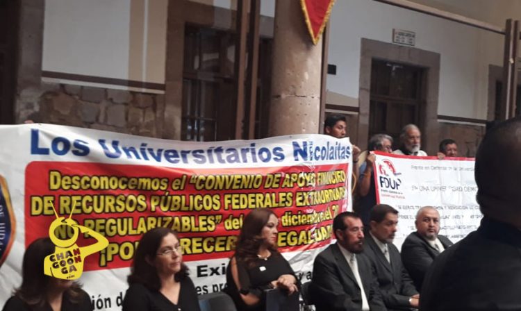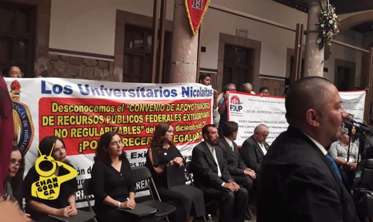«Desconocemos el convenio de apoyo financiero de recursos públicos federales extraordinarios no regularizables del 21 de diciembre de 2018, por carecer de legalidad», las lonas estas firmadas por MDJEDAU y MODDU Nicolaíta.