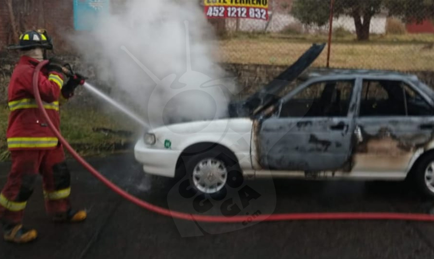 El suceso fue este lunes. El vehículo de alquiler es uno de la línea Colibrí, con número económico 60, mismo que quedó parcialmente quemado, unidad que estaba parada a un costado de la carretera Uruapan-Pátzcuaro justo frente al entronque de La Cofradía.