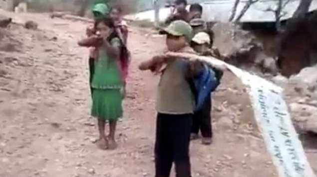 En las imágenes se observa a los niños que portan palos, algunos en formas de armas, toman posiciones de combate y dan lectura a un comunicado en el que dicen ser sobrevivientes de los enfrentamientos ocurridos en enero pasado en el poblado Rincón de Chautla.