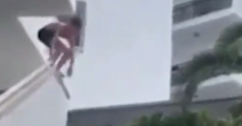 La grabación publicada en redes sociales muestra al hombre realizando ‘balconing’, práctica que salió mal y lo dejo con fracturas en la clavícula y en varias costillas.