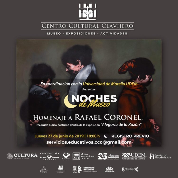 Este jueves, 27 de junio a las 6 y 7 de la noche, dentro del programa “Noches de Museo”, el Centro Cultural Clavijero (CCC) ofrecerá el recorrido lúdico nocturno de la exposición «Alegoría de la Razón», en homenaje al artista y pintor mexicano Rafael Coronel.